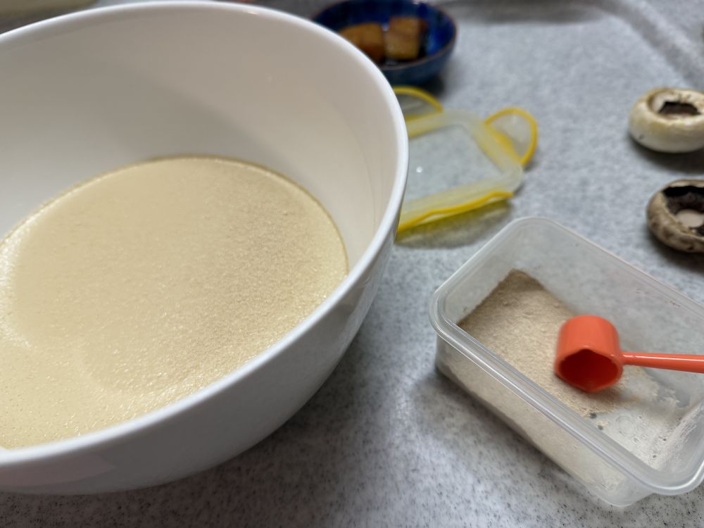 搅拌开酵母水,放入低筋面粉,面粉的量根据水量和需要的软硬程度加减法。我家没有称,从来也没用过称量法做面食。