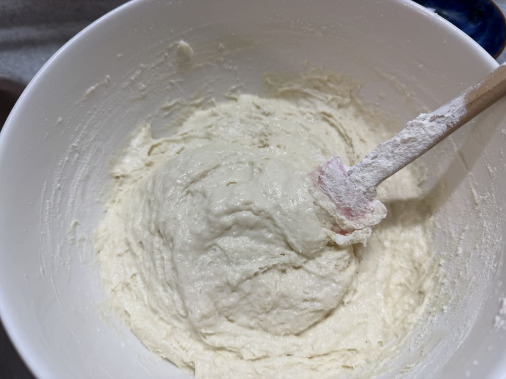 面团软硬到这个程度就可以,如果新手,可以再加半杯面粉,面团硬一点好成型。尽可能的搅拌均匀一点,这样再进入发酵阶段,面团会醒发均匀。