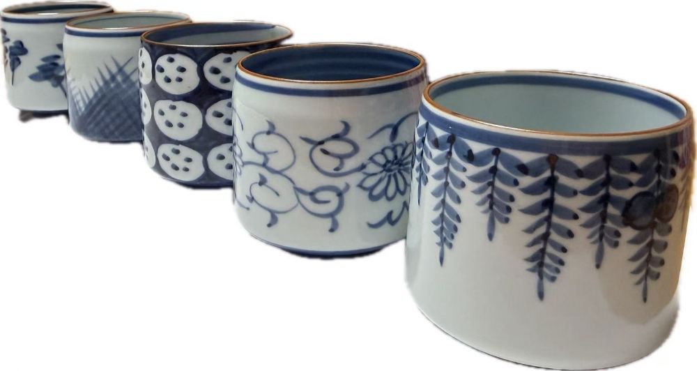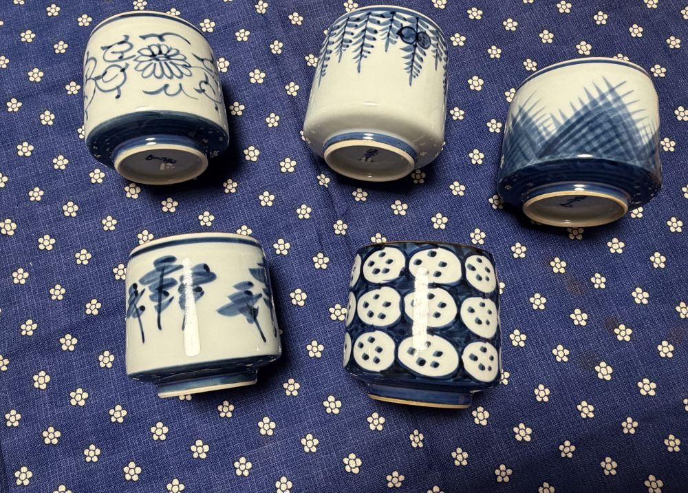 我这一套不完美,有一个杯子里有一个小黑点。。。但是不妨碍我对这套茶具的爱。里面都是采用了淡蓝色的有田烧器的代表色。每个杯子的外部和内部涂染相对应。
