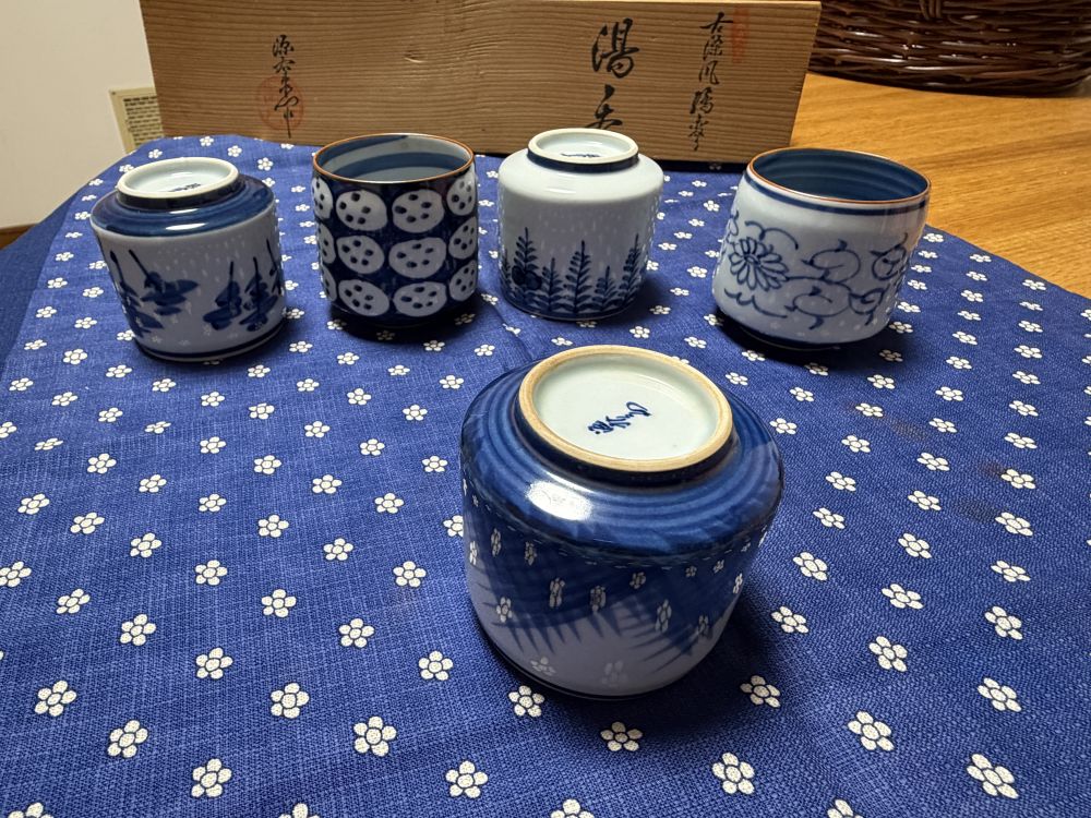 这一套是源佑卫门的最早期的代表作品。古朴的蓝染基调,搭配杯口的茶色镶边,就是源佑卫门窑最早期的标志。喜欢这个窑的很多作品,茶杯特别的好用,手感好,茶杯厚实,安全感十足。