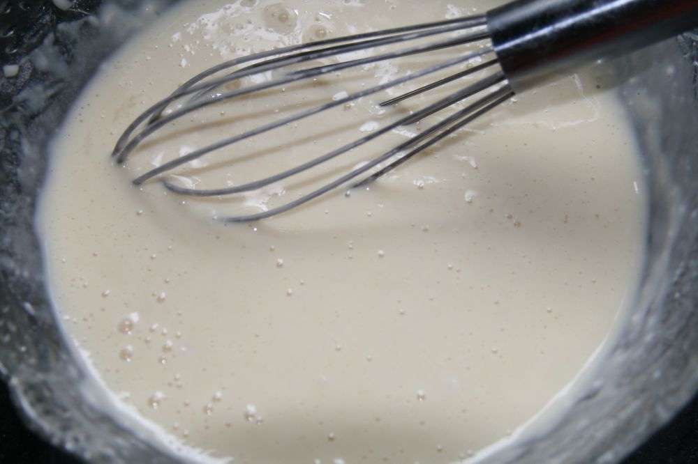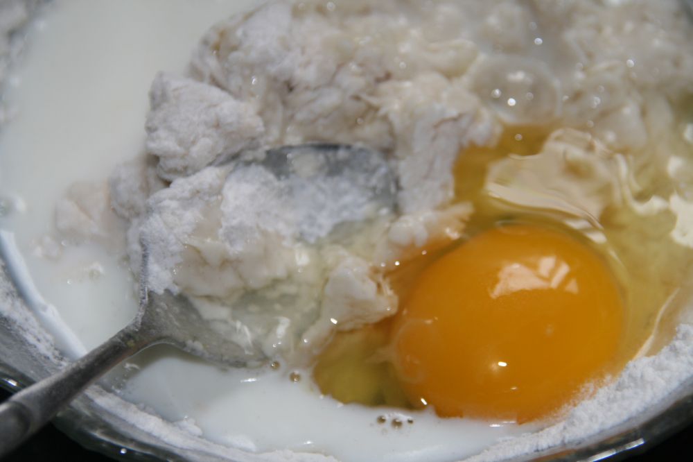 第一步,调面糊。用牛奶和面,加一个生鸡蛋搅成糊。慢慢加牛奶,不用太稀,因为后面加西葫芦也会出一点儿水。