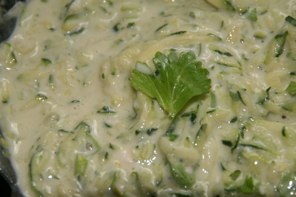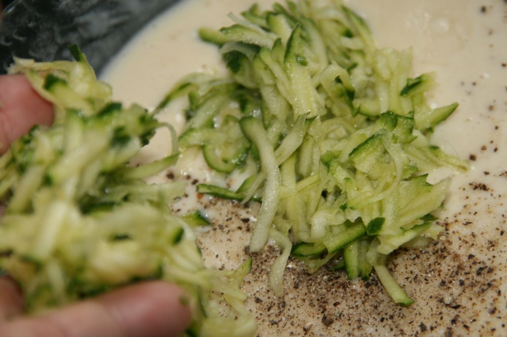 第二步,西葫芦擦丝儿,然后放到面糊里拌匀。加盐和黑胡椒碎。芹菜叶儿我也是这一步加的。图上的叶子是个示意哈,我放了一小把儿。
