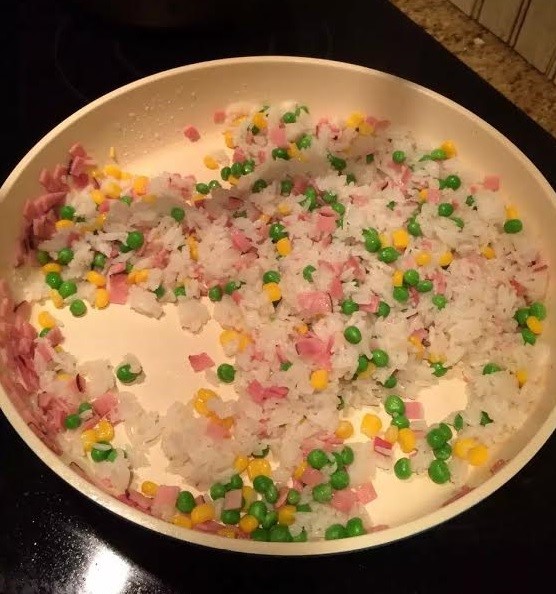 辅料:火腿(腊肠、培根都行,炒肉馅儿也好吃)、洋葱、青豆、玉米、葡萄干儿(不放也行,家里有什么干果儿都行)