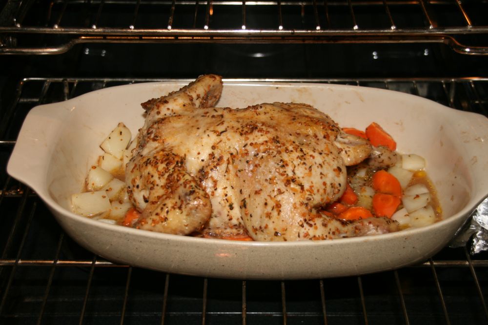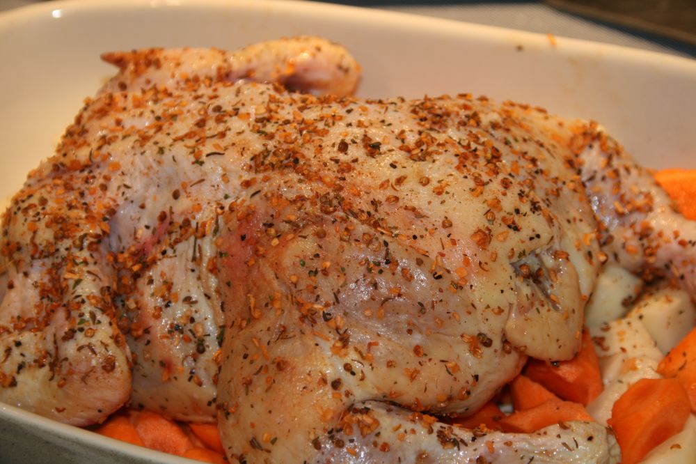 村儿里大姐推荐的Costco蒙特利尔烤鸡调料(以前我用蜂蜜、酱油、辣椒粉和italian herb刷)撒上,肚子里边抹一遍,塞上拌好调料的洋葱,用牙签儿把后门儿别上,土豆、胡萝卜垫底。锡纸包严。450华氏度bake 45-55分钟,打开用筷子叉,没有血水了去掉锡纸,往上浇开水(凉水烤盘就炸了),让鸡油稀释一些把土豆和胡萝卜浸熟入味儿。你们烧来的各种法国铸铁锅终于有用武之地了,有这些个价值几百上千(美元哈)的家伙式儿能把锡纸钱省下来不少。