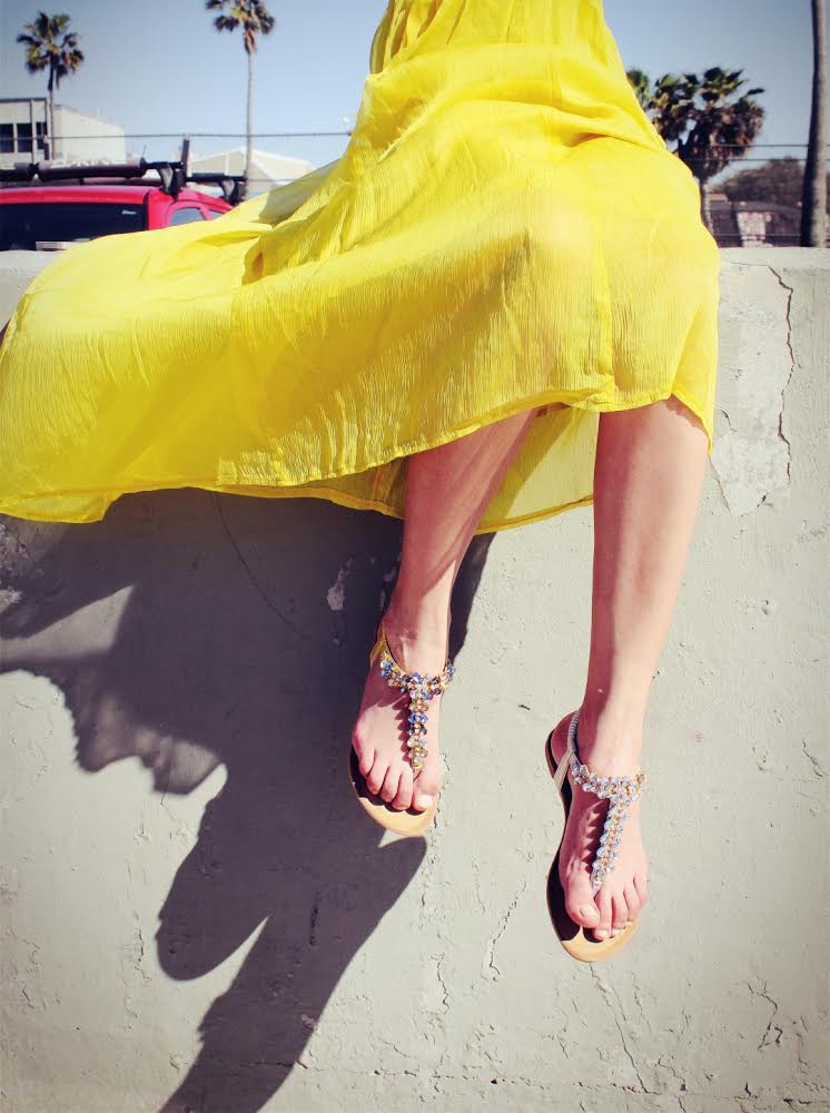 黄色的裙子是今年夏天的必备,配自己喜欢的鞋子就好了,但要配的出彩:)有一点黄色呼应会突出整体的时尚感~~