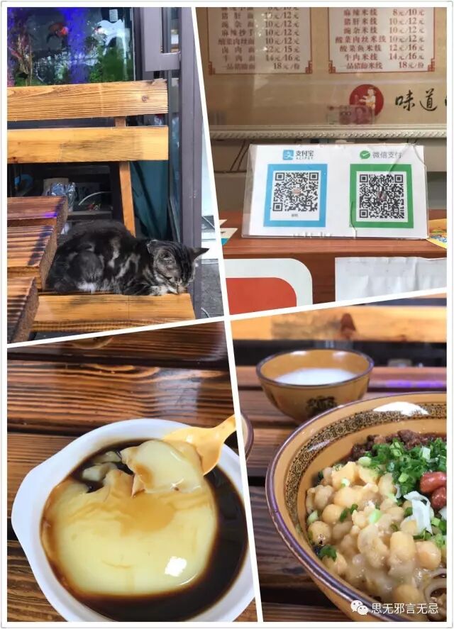 有天在锦城湖跑完步,骑着共享单车,来到一家路边面店。店内逼窄,桌凳多放到了外面,选择“很多”,起码七八样,可以扫码支付,还有只猫陪你同吃。