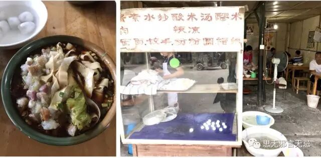 过了两天,跟朋友约爬青城山,7点早起,去山下的小镇吃早饭。朋友轻车熟路,入了陋巷,来到一家(我们在说苍蝇馆子是吧)“苍”得不能再“苍”的小店,里面黑咕隆咚,朋友介绍说“这家不算挤,本地人来吃的多”。于是安坐,一面,一汤圆。我心贪,加了个醪糟蛋。