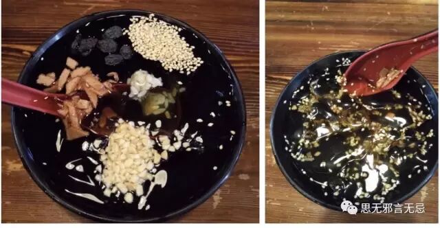 于是点了碗豌杂面,一个红油抄手,后来又加了个凉糕。也就30左右。味道如何?八个字:好吃得喊,巴适得板!尤其那个米浆做的凉糕,以前没怎么吃过,实在惊艳。与冰粉的爽口应舌稍有不同,同样的软糯香甜,但其Q弹处刚好用得上你的牙。必须在冰箱冰镇,即食即取,必须调以红糖水,还有个必须,算我加的:必须在饭食最后,尤其已经过辣咸热鲜。唯其时,有如金风见玉露,大旱逢甘霖;那些上来就点的,说好听是品甜品,不好听就是任性(老婆,没说你)。