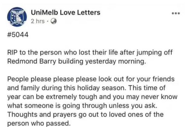 而就在上个月,墨尔本大学同样发生了一起跳楼自杀事件……一名男生爬上教学楼后跳下自杀,可能是由于课业压力过大导致……