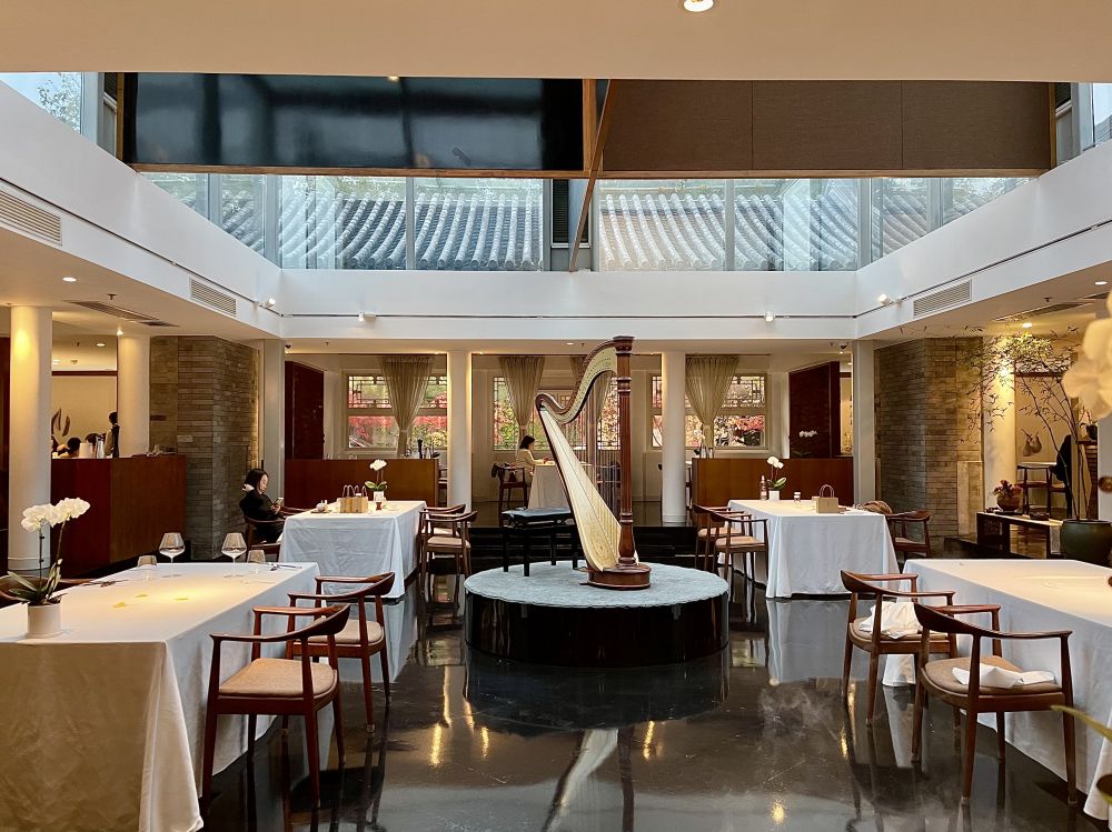 拐过一段小道,“京兆尹”三个字静静悬在灰砖墙中央。石板、木梁与玻璃天井交织出一种古今交融的美。迎宾的帅哥与小姐轻声问候,步伐轻盈,笑容恰到好处。那一刻我忽然觉得,这顿饭,不只是吃,更像是一场需要用心去感受的仪式。四合院里的光影温柔,像旧时的时光重新苏醒。屋檐下偶尔喷出的水雾,让人恍若置身云烟间。中庭水声潺潺,窗外银杏叶微微晃动——每个角落都透着静谧的仪式感。墙上悬着水墨与花艺,中式的古色古香与简约的西式线条相融。入座后,服务员递上饮品与水果,轻声询问是否需要拍照,让每位食客都能留下属于自己的片段。那一刻,连空气都透着温柔。