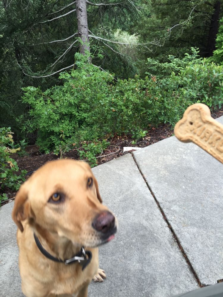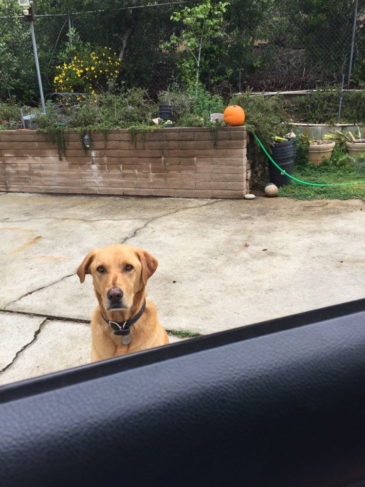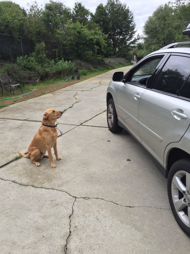 从此以后,我家任何人开车出门时,他都会坐在车前,拿到一块饼干才放你出门。当然,拿到饼干后马上扭头就走。