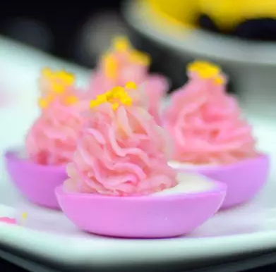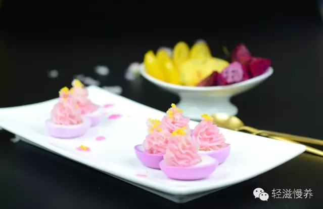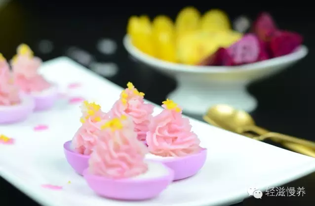 对剖横着切开鸡蛋,一个外粉内白的美丽鸡蛋出现了。轻轻挖去蛋黄,然后将淋了果浆的土豆泥,随意搅拌成晕染状,舀入安置好裱花嘴的裱花袋向蛋白内裱花。