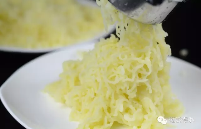 将土豆去皮、切5-1cm 的片儿,锅里放冷水没过土豆片,中火煮10分钟,然后关火继续焖5分钟左右。之后沥去水,用土豆泥挤压器或者大漏勺之类都可以,将土豆片儿压成泥。