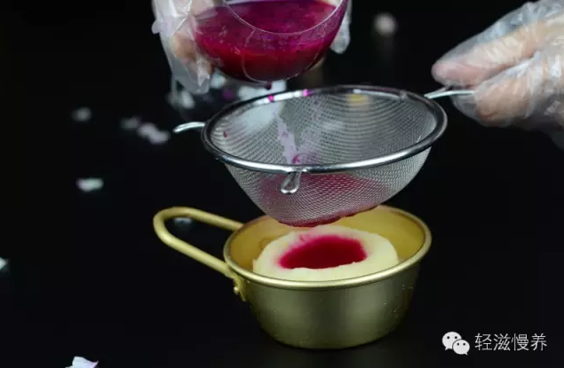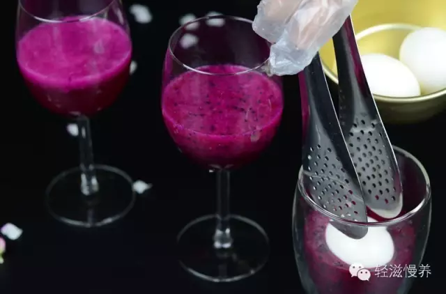 用料理机将火龙果打碎成浆,从左至右分别是1/3火龙果加2/3水、2/3火龙果加1/3水、纯火龙果浆。浓度越高,上色越快。建议一杯纯果浆一个蛋,只需要5分钟-10分钟颜色就艳丽分明了,取出蛋后的果浆还可以直接饮用。再取2/3的土豆泥用来上色,给土豆泥上色时注意用筛网避去黑色籽籽,不要太多,以免太稀影响成型,同时别忘了调入合你口味的蜂蜜。