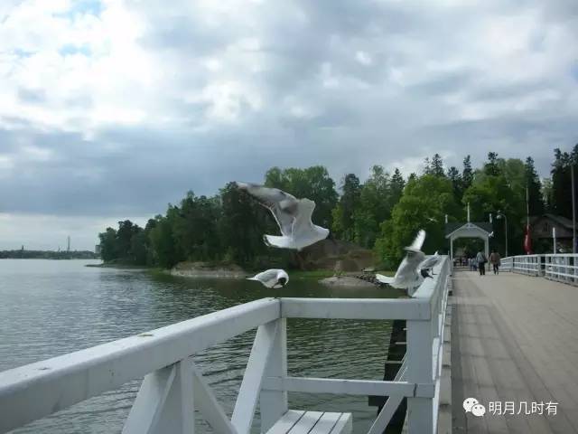 露天博物馆的大门是一座带有亭阁的木质小桥,通往森林茂密的小岛。白色的栏杆上时有海鸥驻足嬉戏。