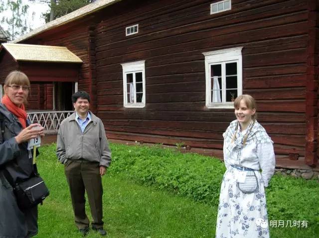 “女主人”(右一)娇小可爱,有问必答,帮助我们了解不少芬兰的农家生活。左一是我们的导游。照片的背景是四合院主房,包括主卧房,客房和厨房。