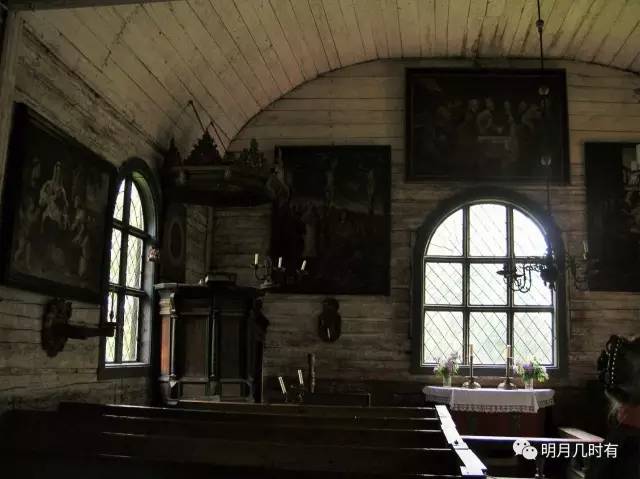 木头搭建的教堂内部简单朴素,其中每一件家具都写满沧桑。不知几百年前,是何人在此讲经布道,侃侃而谈;又是何人驻足停留,诚心祈祷。