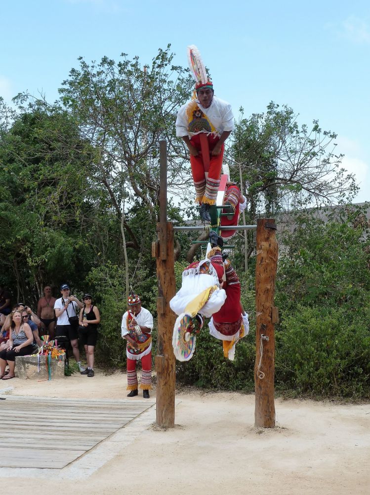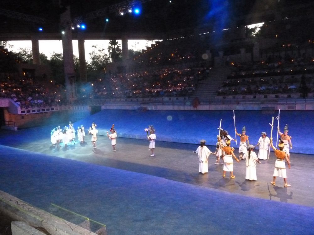 晚上2小时玛雅文化艺术表演。表演分几个篇章,展现墨西哥历史和文化,正义战胜邪恶的故事。表演厅入口处纹身的演员(P 4.13a)