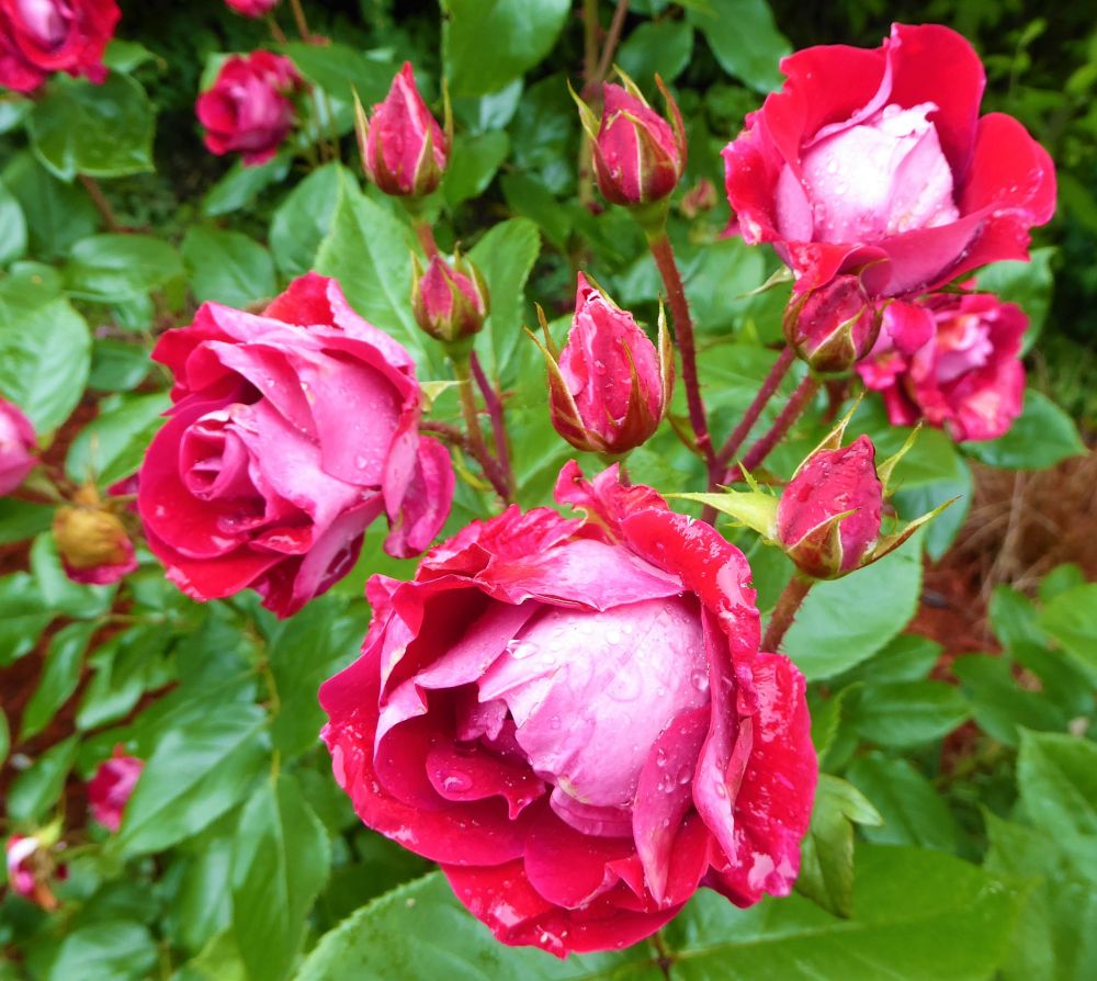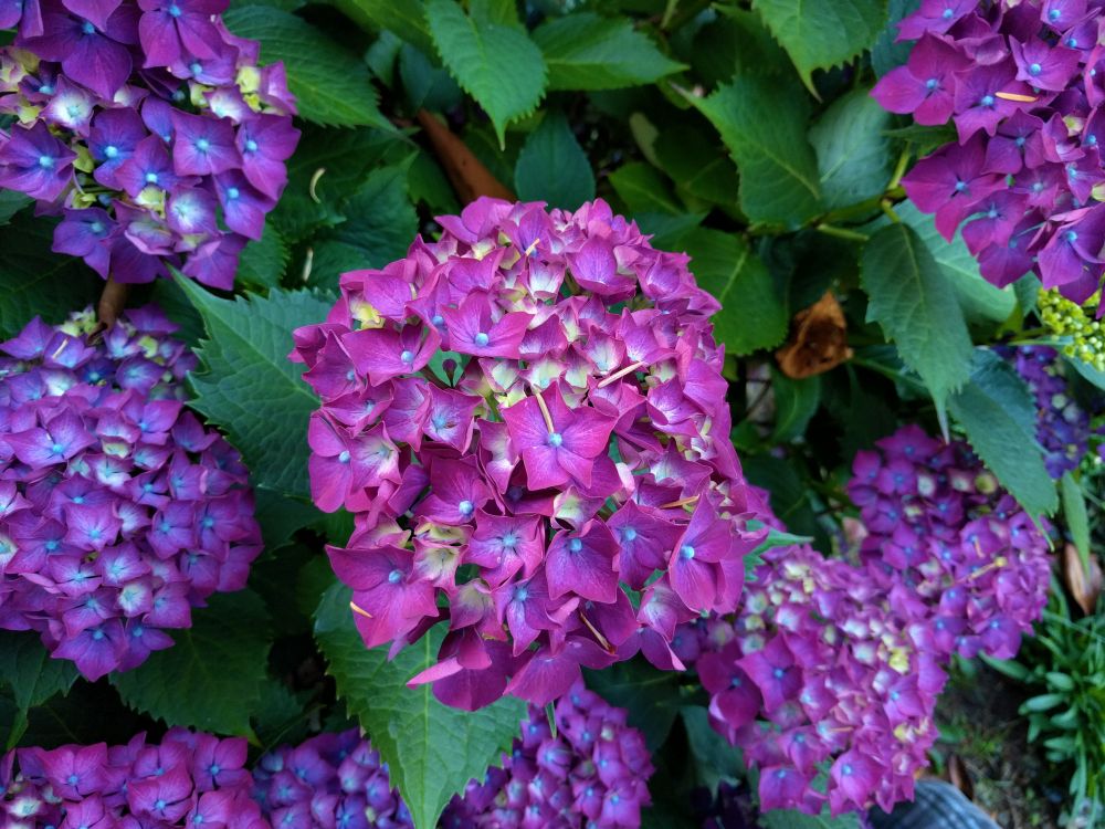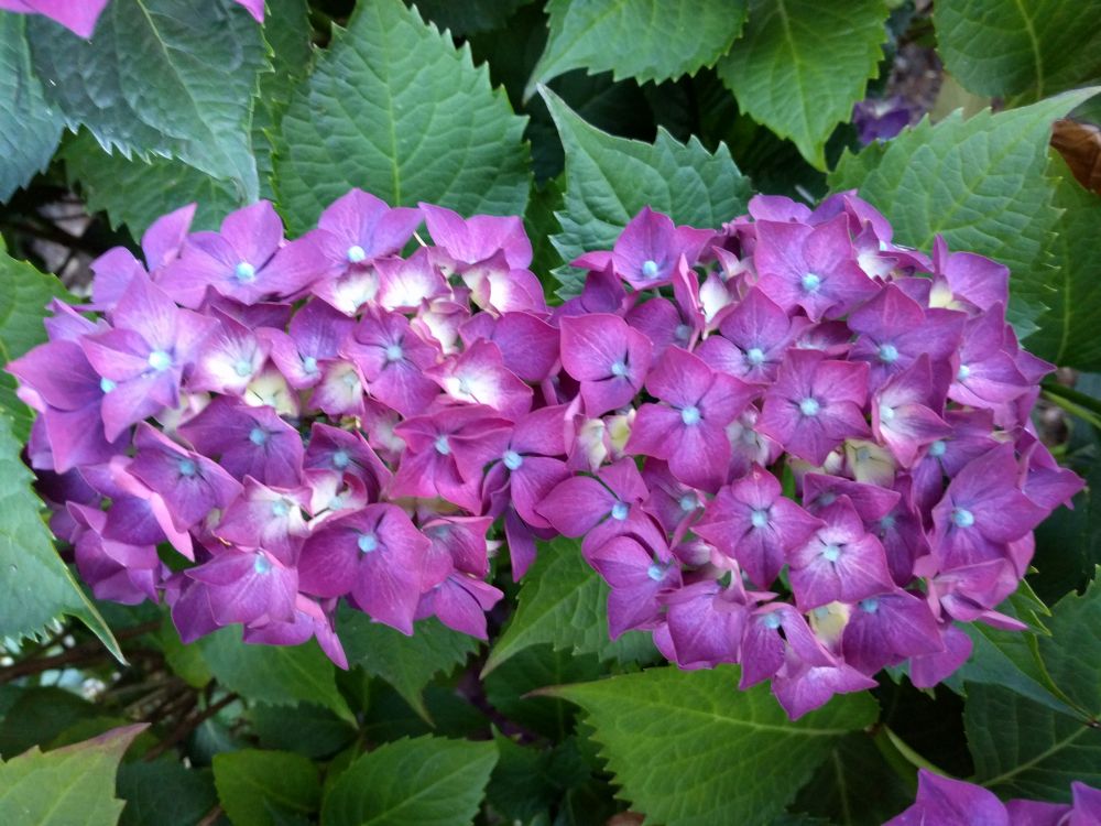 绣球第一次开花是红色的,后来变成紫红色了。注意了一下周围的邻居,发现除了少数白色,绝大多数绣球是紫色或兰色,看来花的颜色不是一成不变的。