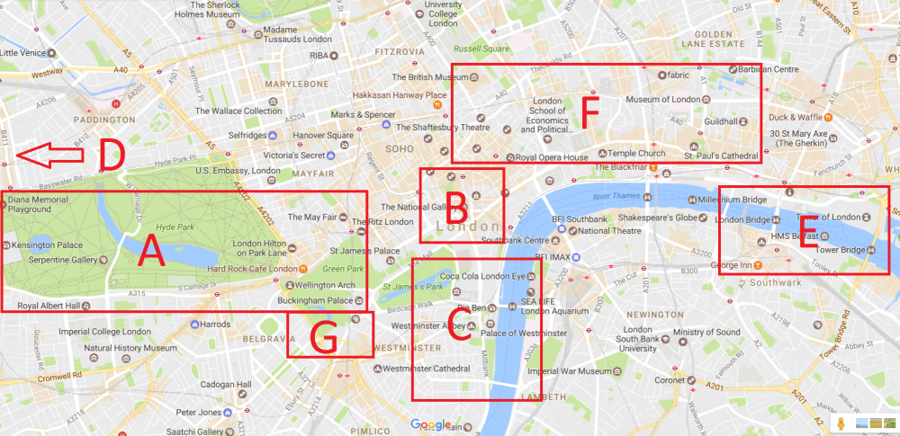 为了方便游览伦敦,白水总结了伦敦 Top 30 著名景点,并按其位置将它们分成7个区域。按照这个路线图游览伦敦,大概需要4-7天时间(取决于你的兴趣和的体力)。区域内的景点大多数可以步行,当然有些需要乘车。伦敦的地铁非常发达,除了郊区的WINDSOR CASTLE要乘火车外,其它地方均可乘地铁前往。建议你买一个通票。同时最好有London Pass,不仅方便,而且划算。为了不造成大家困扰,景点名称不译中文(同一个景点,常常有不同的中文翻译),方便你自己网上搜索细节。