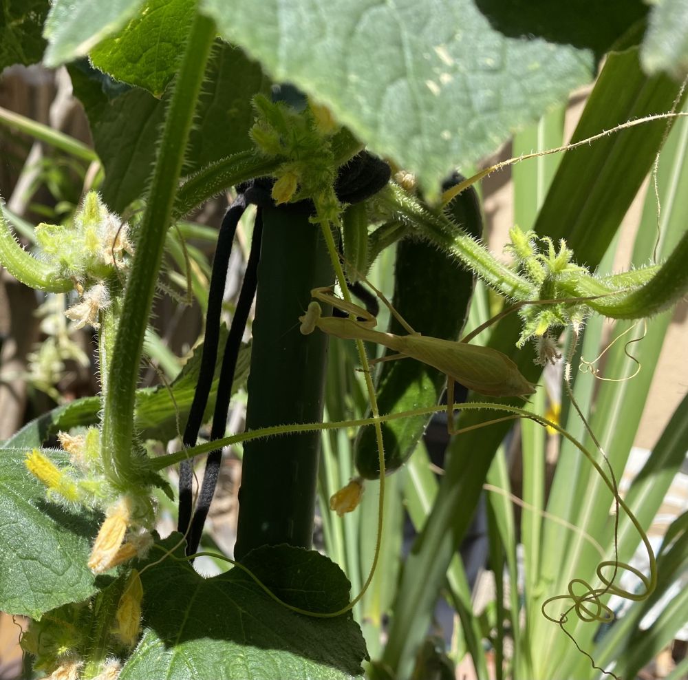 那只刚蜕壳时半灰半青但很快全身又重新披上灰袍的螳螂,终在一日离开了黄瓜藤丛。或许是因为我拍照时不小心打了个喷嚏,惊动了它,令它觉出此地不宜久留。那个阳光午后,我满怀歉疚地目送它爬上高高的绿色塑料杆,昂首探寻新的栖所。最后一次见到它,是在丝瓜叶的背面,之后便再无踪跡。