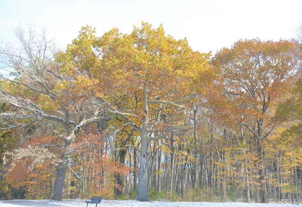 邻居家后院子有棵高大的水橡树(wateroak),多数年头适季落叶,露出苍劲古色;也有几年下好几场大雪后树枝上依然满挂铁锈色的叶子,以为已经枯死,第二年又发出新芽,象调整一下自己的闰月而已,依旧茂密。