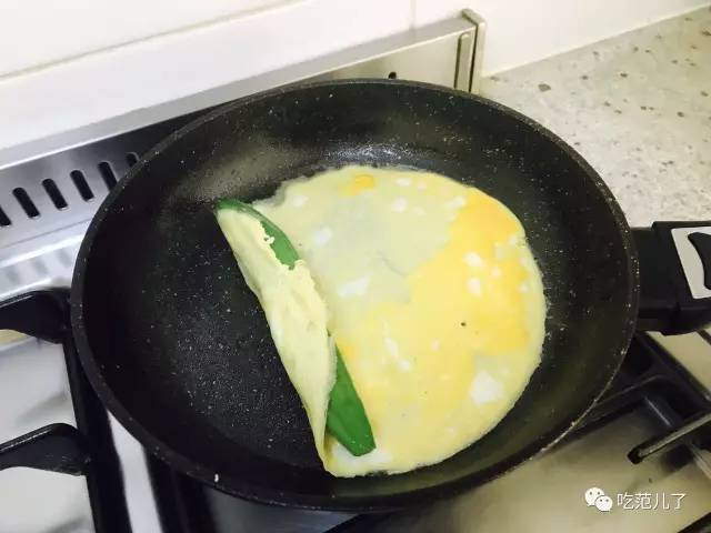 5.蛋液稍稍定型把秋葵排成一条直线放入蛋饼。