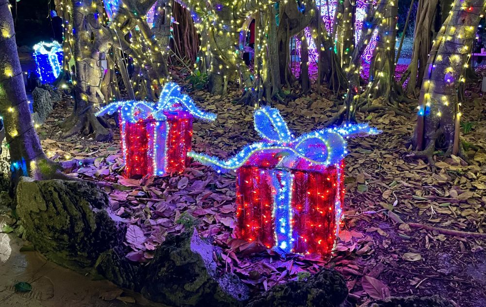 因为还要到附近的Pinecrest看灯展,我们只好依依不舍地离开Miami,半个小时后到了今天最后一站,Pinecrest Gardens。Pinecrest Gardens 是一家村办公园,它的前身是建于1936年的Parrot Jungle鸟类游乐园,2002年Parrot Jungle搬到了Miami海边的Watson Island,就在Bayfront Park对面不远,并更名为Jungle Island,如果来Miami时间充裕,可以去游玩一番。Parrot Jungle搬走后,Pinecrest村买下了这片占地14英亩的植物园,并改名为Pinecrest Gardens。现在的Pinecrest Gardens是一个历史景点,拥有1000多种热带植物,儿童乐园,触摸动物的小动物园,园子里常年举办各种文化艺术活动,娱乐表演,深受当地人喜爱。今年的圣诞节灯展从12月11日到新年,每天晚上6-9点开放三个小时,有几千个节日主题的灯饰巧妙安排在公园里弯弯曲曲的小径两侧,有各种动物形象,鱼类,礼物,植物,等等,形态各异,美轮美奂。这个灯展1-2个小时可以看完。
