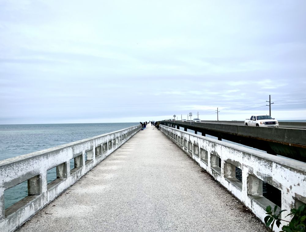 七英里桥(Seven Mile Bridge)是一号公路这一段最长最著名的跨海大桥,东连Middle Keys的骑士礁(Knight‘s Key),西接Lower Keys的小鸭礁(Little Duck Key)全长近七英里。现在看到的七英里桥实际上是两座桥,老桥在北,新桥在南,十分优雅地并行在美丽的海面上。老桥是Florida东岸跨海铁路的一部分,1935年Florida州政府修建跨海高速将七英里桥改造成公路桥使用,直到1982年新桥建成通车,老桥也随之弃用。老桥有几处断开形成断桥,十分惊险,有不少电影在这里取景,包括1989年的007电影License to Kill,1994年的True Lies,和2003年的2 Fast 2 Furious。老桥通过的鸽子礁(Pigeon Key)离骑士礁2.2英里,这段老桥现在不对机动车开放,游人可以步行或者骑车上桥,桥上可以钓鱼,鸽子礁上有一个历史教育中心和一个火车博物馆,游客可以参观博物馆或者到旁边的海里浮潜。