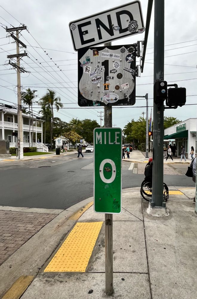离开要塞之后我们就一路走去Whitehead Street 各网红景点打卡。最北边和Greene Street 交口处是Mel Fisher Maritime Museum,我们因为时间关系就没走那么远,而是直奔Fleming Street交口处的一号公路终点。一号公路终点路牌在Whitehead Street 上 Fleming Street 十字路口南侧,这里要说明一下,一号公路进入Key West 后在右转沿N Roosevelt Blvd,Truman Ave向西南到Whitehead Street 右转沿 Whitehead Street 到 Fleming Street 交口的终点,这最后一小段的一号公路南实际是往西北方向去的,所以你看到的一号公路南终点路牌是指向 Whitehead Street 西北方向,马路对面的一号公路北起点路牌是指向 Whitehead Street 东南方向,两个路牌都有很多人远道而来排队合影留念。路口旁边有个售卖纪念品的小店,没什么特别的,但是这个路口还蛮有意思的,同一个地方,一个方向看去是终点,转个身,就是起点了,终点,起点,谁能说得清楚,这本就是一个高深的哲学问题,而一个转身又包含了多少的人生智慧。