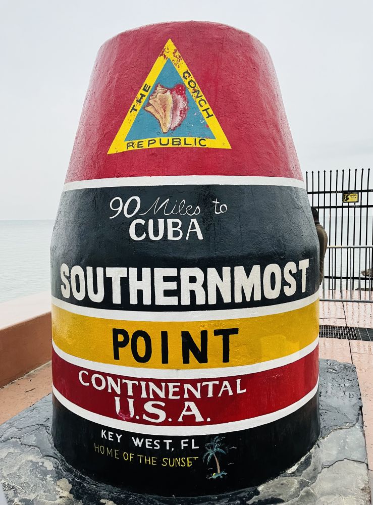 沿Whitehead Street 向东南几十米马路右侧有一棵巨大的木棉树The Kapok Tree,木棉树是玛雅人的神树,传说人去世后灵魂可以通过木棉树高大的枝干升入天堂,Whitehead Street 上的这棵木棉树干粗壮,树冠巨大,枝叶茂密,煞是好看。继续向南过了Olivia Street 左边是海明威故居(The Hemingway House and Museum),海明威和第二任妻子Pauline Pfeiffer 1931-1939 期间在这里生活了九年,他最受欢迎的小说里有几本就是在这里写的。这个博物馆还因为海明威之猫而闻名,正常的猫前爪五趾后爪四趾,海明威之猫天生多趾,这种多趾缺陷还会遗传给后代,海明威当年养了一只叫Snow White的六趾猫,现在这只六趾猫的很多后代多趾猫也还生活在这栋房子里。海明威故居门票只收现金,价格小贵。Whitehead Street 马路斜对面是Key West Lighthouse,这个灯塔最初建于1825年,位于Key West 最南端,后来1846年被飓风破坏,1848年重建的时候将灯塔位置向岛内挪了半英里到现在的位置以策安全,灯塔1969年退役,梦露县将这里改造成了一个灯塔博物馆,洁白的塔身掩映在高大的树木之后,非常漂亮,我们到这儿的时候灯塔已经闭馆了,只能从外面仰望了一下,以后有机会再来参观吧。继续沿Whitehead Street 到最南端尽头就是著名的美国大陆最南端标志了,这是一个27英尺高7英尺宽的混凝土浮标,于1983年竖立在现在的位置,浮标油漆是由当地的漆画艺术家 Danny Acosta 完成,2017年飓风Irma对油漆造成了损坏,Danny 重新上了油漆。现在这里是游客来Key West 拍照最多的景点之一,我们到这里的时候,天空下起了小雨,带来了一丝寒意,不过游人们显然都有备而来,个个不慌不忙,穿上雨衣打上雨伞,高高兴兴地继续排起大队,就为了和这个浮标合个影。我们也不能免俗,作为此次 Key West 之行的最后一个活动,拍完照片,心满意足地踏上了归途。