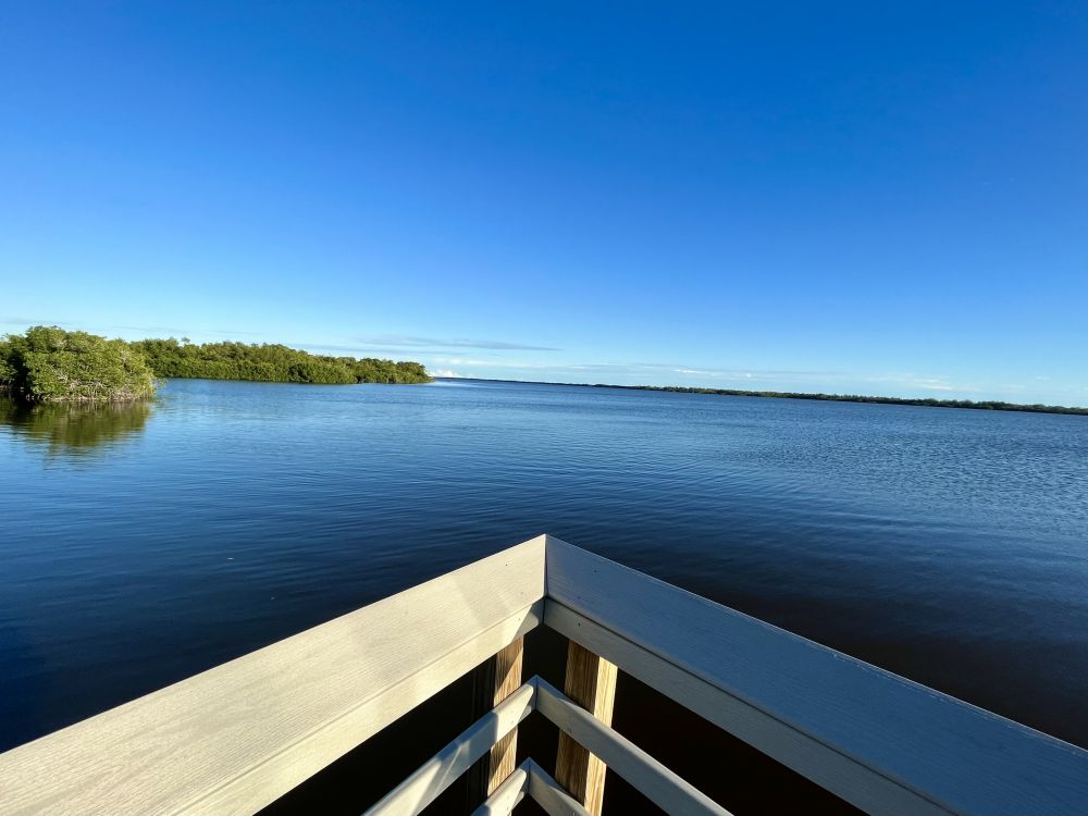 公园主路尽头来到Flamingo访客中心,这个访客中心正在装修,看上去规模不小,相信完成之后会有不少内容展示,值得期待。Flamingo访客中心南临佛罗里达湾,有邮轮服务可以游览海湾,另外还有划船水道,步道等,我们本来准备坐船游览一下,结果路上一磨蹭来晚了,错过了最后一班船,于是就到海边的Guy Bradley Trail走了一下,海湾水天一色,景色宜人。顺便提一下Guy Bradley, 他是美国最早的一批狩猎监督官,在大沼泽国家公园还没有建立的时候就开始以一己之力保护这一带的鸟类了,1905年7月在阻止三父子猎杀白鹭的时候遭枪杀殉职,年仅35岁,他的死引起了广泛关注,并促使后来佛罗里达州立法保护鸟类,为了纪念他,有几项国家奖励和几个地名以他的名字命名。从公园出来的路上又在大沼泽里的西湖(West Lake)停了一下,西湖地处佛罗里达湾边缘海水淡水混合的地方,鱼类虾类品种丰富,修缮整洁完好的步道穿过一片红树林到达湖面上,红树林里可以观察black mangrove 特有的呼吸根,非常神奇,树上随处可见漂亮的菠萝花(Bromeliad),来到水边,西湖水一片纯净湛蓝,美的让人心醉,湖上还有一条划船水道可以直达佛罗里达湾,要是能在里面划上一段真的是赛过神仙。
