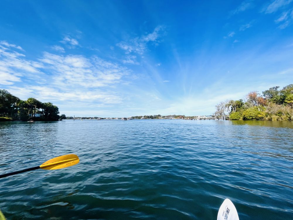 我们去的那天气温不算太高,潜水怕冷,提前预定了划Kayak 看海牛,Kayak比 Canoe好掌控,也更安全。Kayak 有Sit-on 和 Sit-in 两种,前者船体是空心夹层,水进入船上会沿排水孔流出,基本没有沉船的危险,离岸后如果想下水游泳浮潜,上下船都比较容易;后者是一个实心层船体,好处是轻便,坏处是 cockpit进水太多会沉船,非专业人士基本没有办法在水中排水,个人一般不是很推荐没什么经验的人划这种Kayak,但是这里有一种全透明的Sit-in Kayak,海牛从船下穿过的时候可以看得很清楚,有可能的话体验一下还是挺酷的。我们在一家叫 Crystal River Kayak Company and Dive Center 的小店租了Sit-on 的Kayak,单人双人的都有,时长三个小时,足够把Crystal River 到 King's Bay 的这段看海牛最热门的地方仔仔细细玩个遍了。这家店的码头就在停车场旁边,很方便,划船进入一条安静的水道,穿过一个涵洞很快就到了Crystal River上比较热闹的河段了,Three Sisters就在十来分钟远的地方,几个浮标和绳索做成的隔离带将海牛庇护所隔离开来,划船潜水乘机动船看海牛的游客在隔离带外看着成群的野生海牛悠然自得,或休息,或戏水,不时有海牛游出来,从船下或者游水的人旁边慢吞吞的滑过,时不时能听到初次看野生海牛的人惊呼,快看,又两只。旁边有海牛保护的管理人员看着,有人越过隔离带立刻提醒,这里对蓄意越界进入海牛庇护所的人罚款金额是$5000,惩罚力度还是不小的。继续往西滑不久就到了King's Bay 了,从码头算来也就半个多小时,这里视野开阔,天高水蓝,洁白的海鸥不时从头顶飞过,各种船只划艇进进出出,非常热闹漂亮。