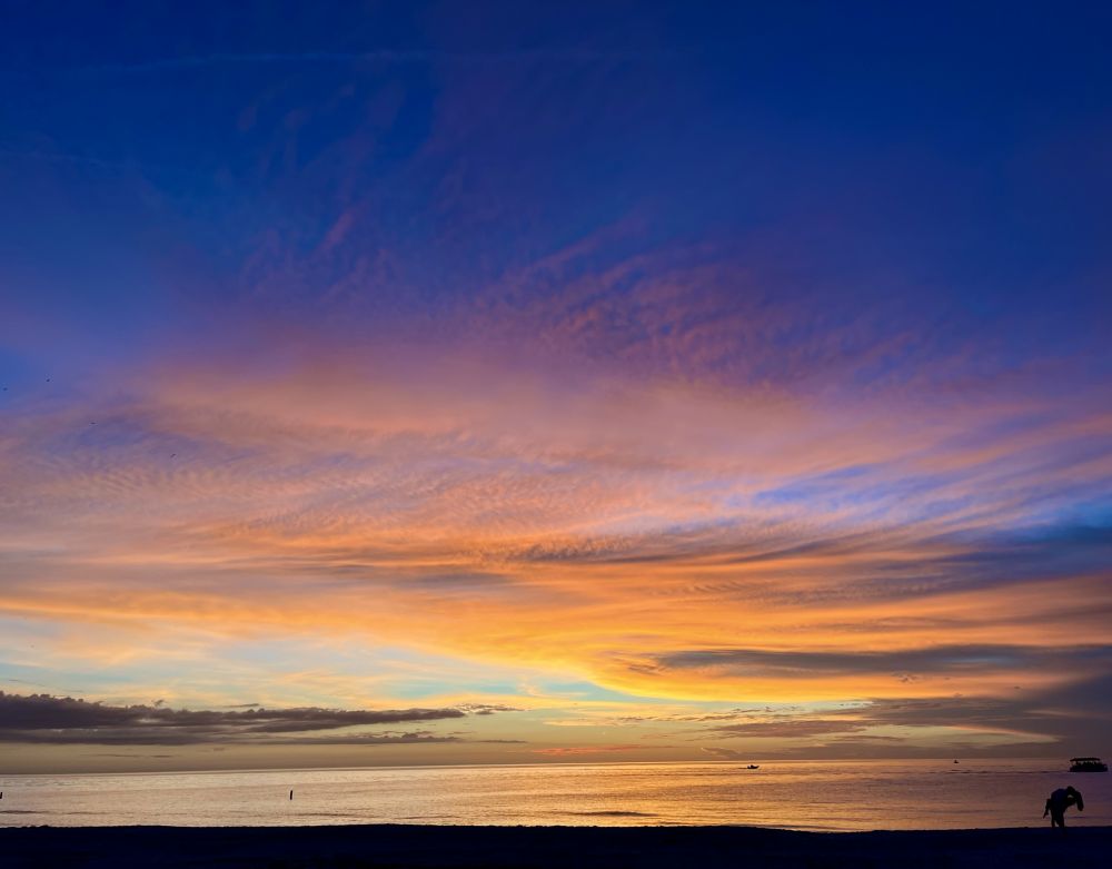 下午回到酒店简单休息一下,正好出发去海滨小城Clearwater 的 Sand Key Park 看日落。Clearwater是位于Tampa Bay东北角临墨西哥湾的一座城市,是Tampa-St Petersburg- Clearwater 都市圈的重要一极,人口十一万多,在Tampa以西二十多英里。从St Petersburg 附近Madeira Beach 开始的墨西哥湾沿岸离岸沙洲岛向北延伸几十公里直到Clearwater,Sand Key Beach和 Clearwater Beach 是位于Clearwater境内的两个优质海滩,两个海滩一南一北被 从Tampa Bay 到 墨西哥湾的 Clearwater Pass 一条水道隔开,现在有一条800多米长的Sand Key Bridge 相连。北侧的 Clearwater Beach 在闹市区,附近很多度假酒店,相对拥挤,停车费较高。南侧仅一桥之隔的Sand Key Beach 位于当地的公共公园 Sand Key Park 里,停车方便,价格公道,设施完善,如果只是去一两个小时看日落,这里比北边强,公园沙滩上和水道大桥上都是绝佳的观看日落的地点。海面上一轮红日缓缓西沉,海天之间像燃起冲天大火,红橙黄蓝紫不断变幻,流光飞舞,一直随海水延伸到脚下。海风轻轻吹拂,带来墨西哥湾温暖湿润的空气,沁人心脾。左右两侧的高楼沐浴在落日的余晖中,背后的大桥跨过暗蓝色的水道披上了金色的纱,静谧而又温暖。落日一点点下沉,最后淹没在茫茫的大海里,只剩下满天红霞,水道前的海面上开始热闹起来,大大小小的快艇帆船依次归航,在水面上留下一条条白色的水线,消失在宽阔的大桥下面。沙滩上的人们纷纷收拾东西踏上归途,一切最后都让给了黄昏前的宁静。