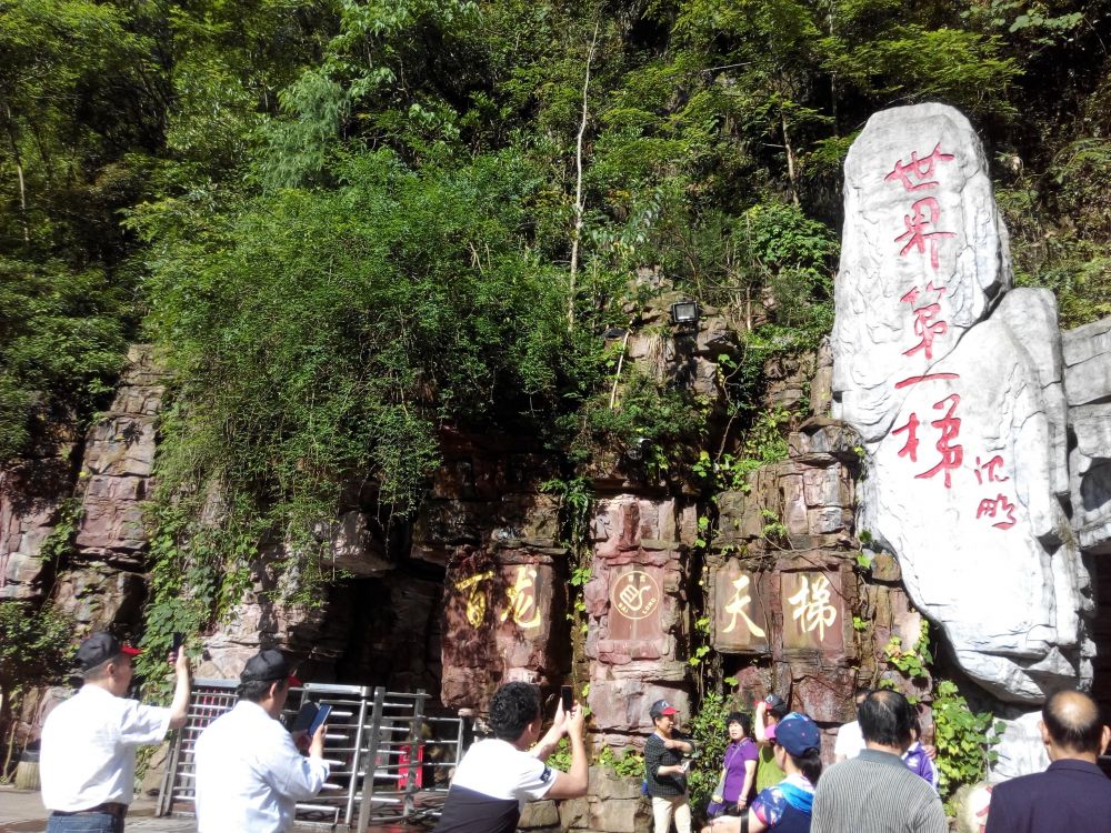 百龙天梯位于世界自然遗产张家界武陵源风景区。导游介绍,天梯垂直高差达335米。电梯运行高度326米,主体由154米山体内竖井和172米贴山钢结构井架等组成,采用三台双层全暴露观光天梯并列分体运行,是连通森林公园、金鞭溪、乌龙寨、天子山的重要观光交通设施。百龙天梯工程宏伟,工艺复杂,施工惊险,堪称“世界工程奇观”,它的建成创造了三项吉尼斯世界纪录。
