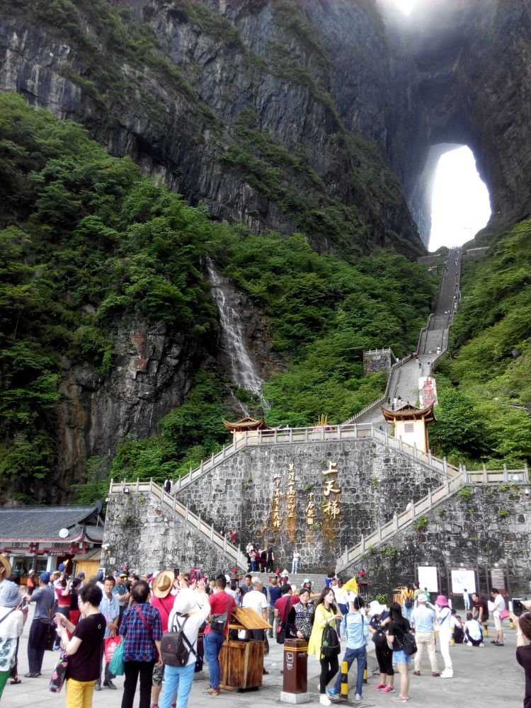我们游览张家界的最后一个景点是天门山。导游向我们介绍说,天门山是集神奇独特的地质外貌、历史悠久的宗教文化、异彩纷呈的人文胜迹、丰富宝贵的自然资源于一体的旅游度假胜地,飞跨7.2公里的客运索道,以世界第一的长度,让游客从城市花园直达原始空中花园,摆脱都市喧嚣浮躁、感受天人合一的明澈写意,从而拥有终身难忘的旅游体验。天门山距市区8公里,海拔1518米,被尊为“张家界之魂”,有湘西第一神山的美誉。山体弧峰高耸,气势临空独尊,世界最高海拔的天然穿山溶洞——天门洞,悬于岩壁之上,成为奇绝天下胜景。天门山还是张家界的第二个国家森林公园,山中四季野趣盎然,变幻多姿,深远有致,宛如一座美不胜收的天仙花园。