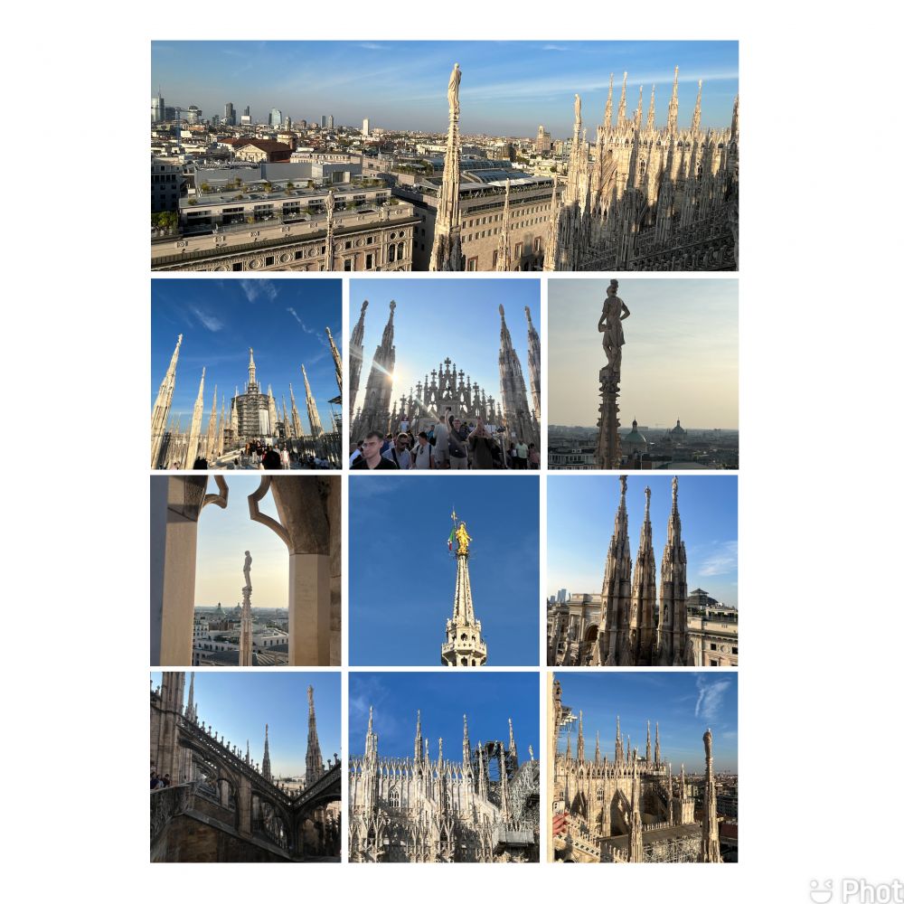 所以在傍晚时分登顶是最好的,随着日落降临,太阳缓缓沉入地平线,天空被染上了绚烂的金黄,那一刻,时间仿佛静止,只留下无尽的唯美与温柔。站在米兰大教堂的屋顶上,看着圣母玛利亚雕像光芒四射,目睹旷世神作,神圣在此刻升华至让不管信不信神的每个人都激动不己。