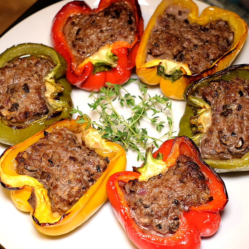 我预热了烤箱,450度(华氏),光预热就要十分钟左右,那也没办法,烤箱大嘛。待预热好,把菜椒放入,有肉的那面朝上,本来就是个“碗”,总不见得碗底朝上。烤三十分钟,成品很好吃,多汁且松嫩……
