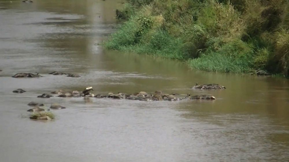 在一个河滩的转弯处,我们见到了上百头的角马倒卧在岸边和浅滩中,周围是上百的秃鹫。河里圆圆的不是石头,是角马尸体
