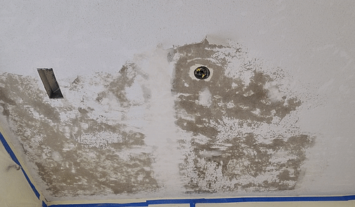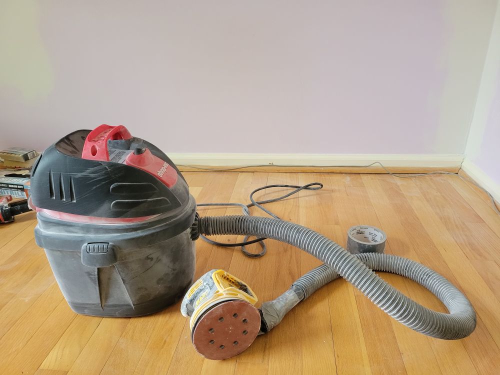 再次把整个房间用 Painters Plastic 包起来, 全包倒不需要,随你。用 Shop Vac ducktape Orbize sander (220 打磨纸) , 把天花板打磨一遍,用手摸,用灯照,之后把天花板用湿的 sponge 擦一遍或者几遍,让它没啥灰。 我这个可以说收了 90%的灰。不过我后来也买了个更长点的管子,所以我不用一手拎着它,一手打磨。