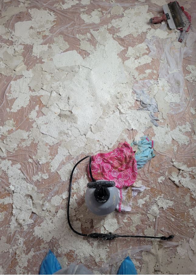 Handhold Sprayer 温水喷湿你当天要搞掉的爆米花天花板。 我家有个爆米花天花板是上过油漆的,特难搞,我在温水中加了醋,还是很难搞,但最终还是搞下来了。