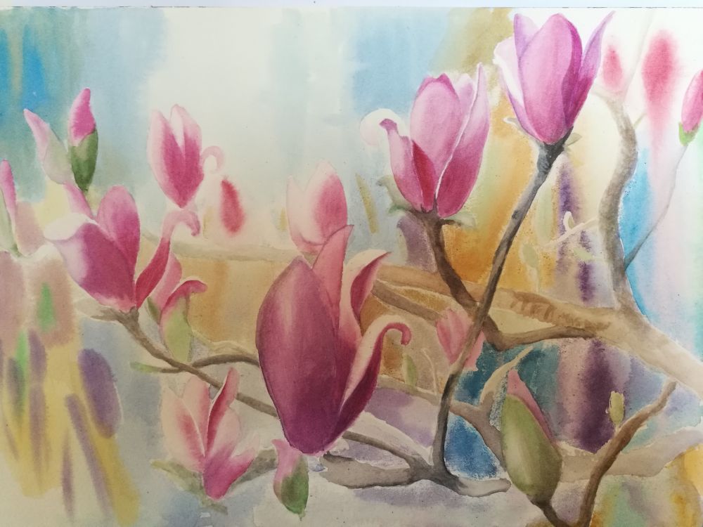好久没摸水彩了,春节期间画了一幅玉兰,画完之后很快立春,还颇为应景。这幅画用了一种新的留白液,不熟悉用法,取下来的时候留下很多痕迹,似乎纸面也有些被破坏,水彩颜料画上去之后产生颗粒状的那种奇怪的“效果”。画得并不理想(其实是很不理想),可是我自己还蛮喜欢的(多么不妄自菲薄啊)。 可是,人生不就是这样吗?我们不会是最智慧、最富有、最美丽的那一个,但我们就是自己,独一无二,能认清自己,欣赏自己,自得其乐就是蛮好的状态。画画也是, 我画故我在,花儿盛开,清风徐来。