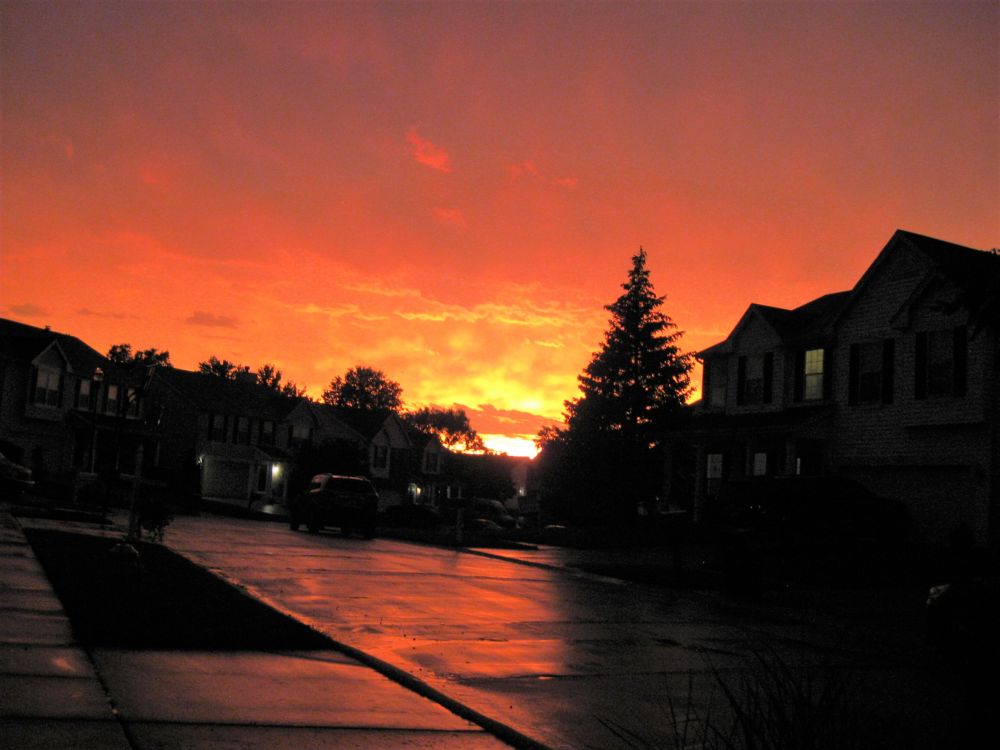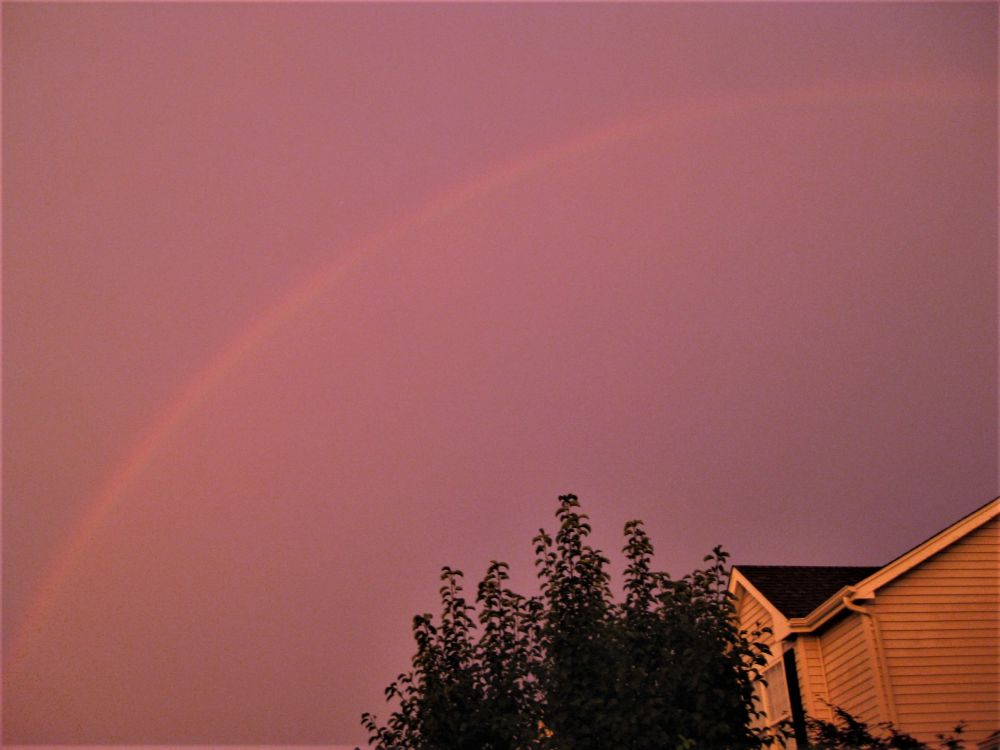 昨天傍晚开始,风骤雨狂。晚上八点半,小雨还在下。在室内看到天空呈橘红色,出门一看,西边夕阳东边虹,遂拍了几张。