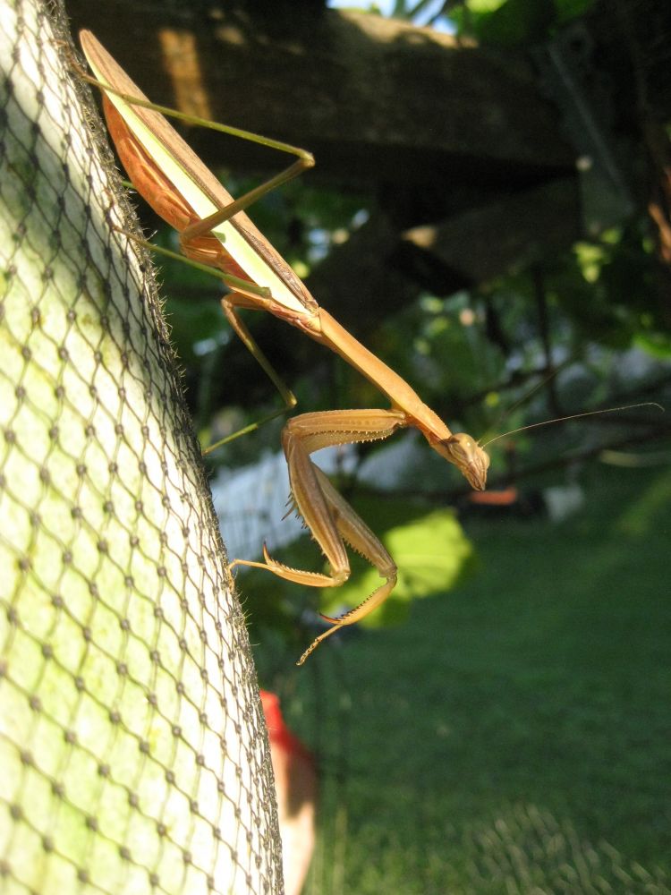 冬瓜已披满白霜,可以摘了。某日探瓜,发现一只威武的大蟑螂。在美国,和蜻蜓一样,螳螂也不多见。可这只蟑螂怎么是土黄色的,印象里螳螂好像应该是翠绿色的呀!