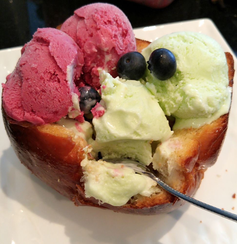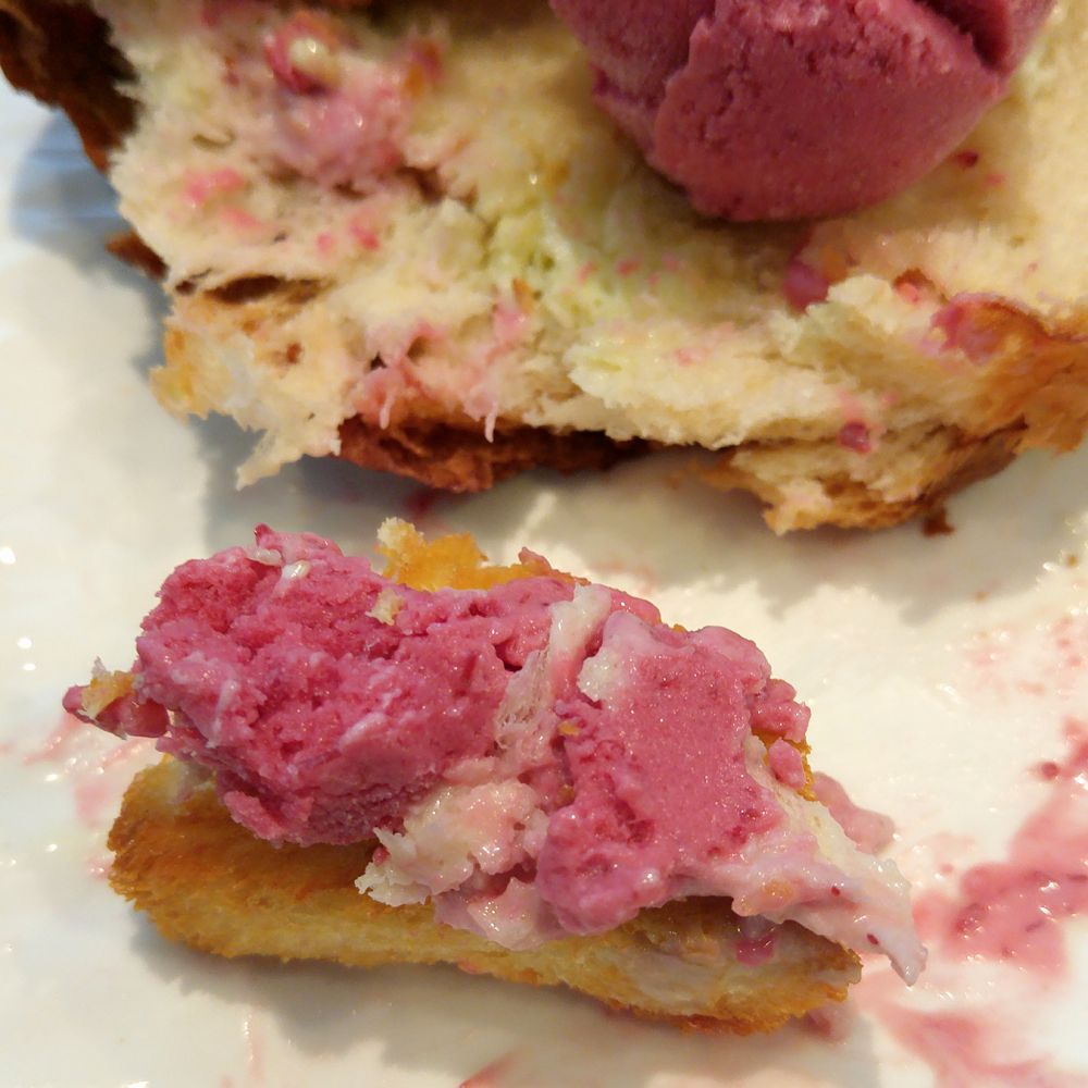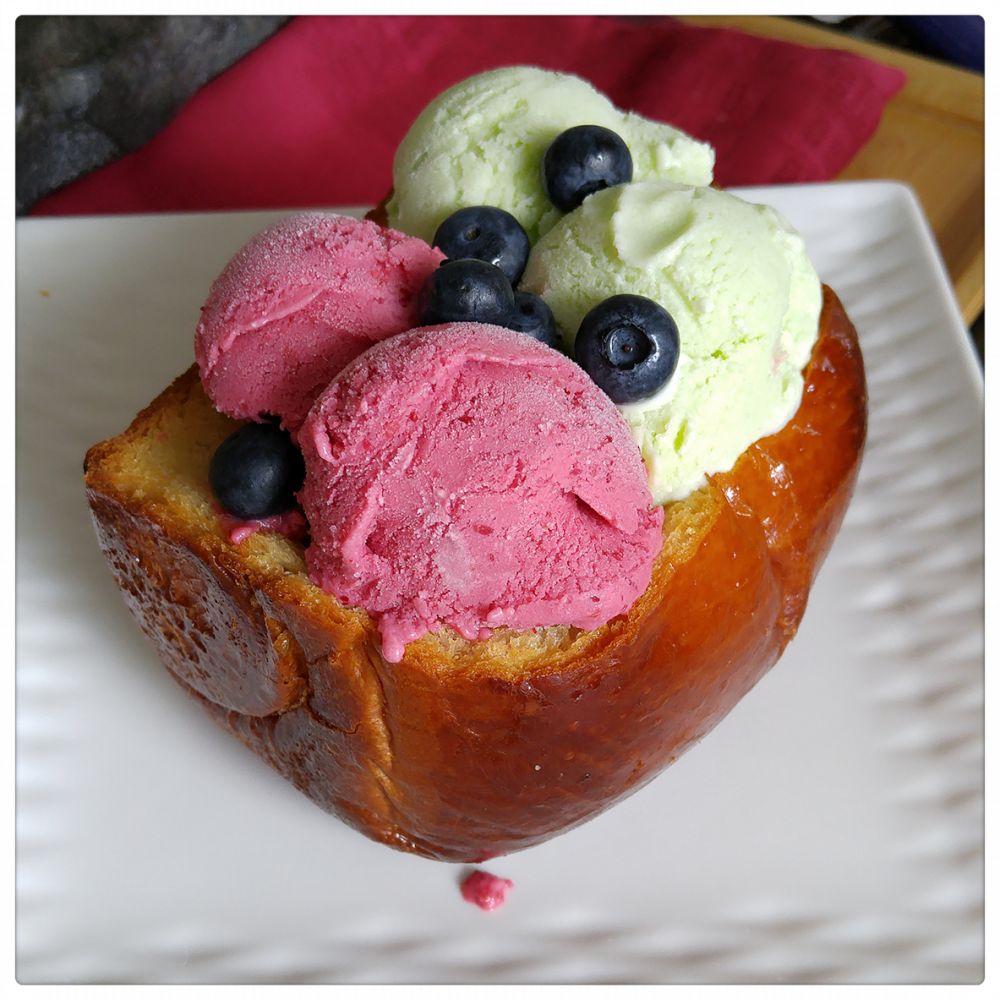 烤好的香酥热吐司加上冰爽顺滑的冰淇淋,一冷一热的感觉在舌尖上碰撞,特别美妙的味觉体验!吐司的焦香味与冰淇淋的奶香味丝丝缠绕,每挖出一个湿润的面包内心,上面都裹满了冰淇淋,又香又软,又松又脆。已经软化的冰淇淋会顺着吐司的缝隙往下流,一层层沁入吐司内部,完全不用担心冰淇淋会融化掉。