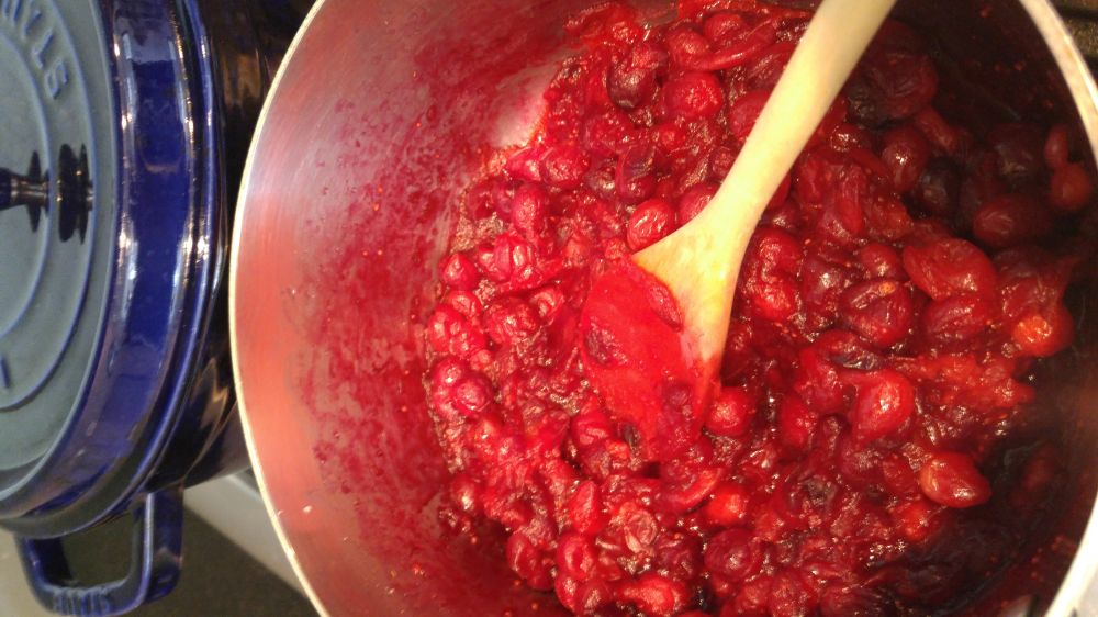 1,把蔓越莓加50克糖,开火加热至糖融化,小火继续煮至莓子开裂变软,关火,