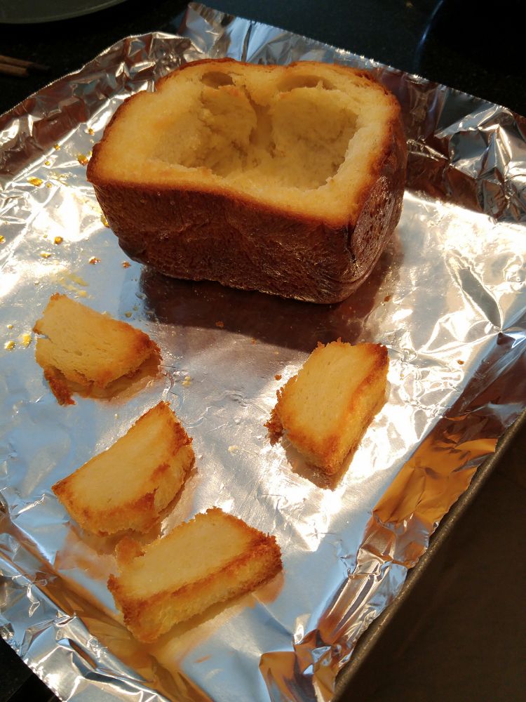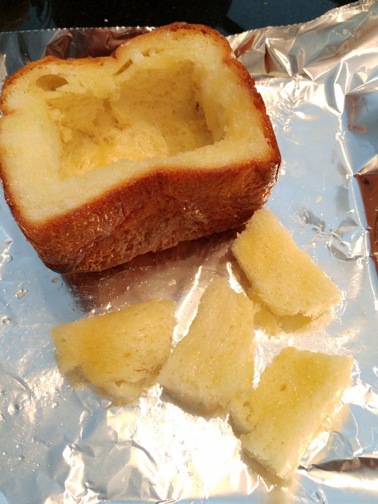 1,取一整条吐司的一半,用刀从吐司中间挖出一个内正方形,把挖出的吐司部分切成小面包片,(正宗的做法是切成9小块正方形的小面包片)