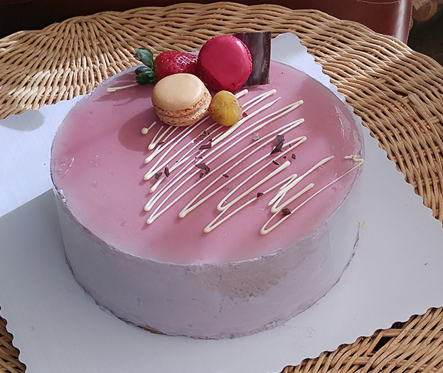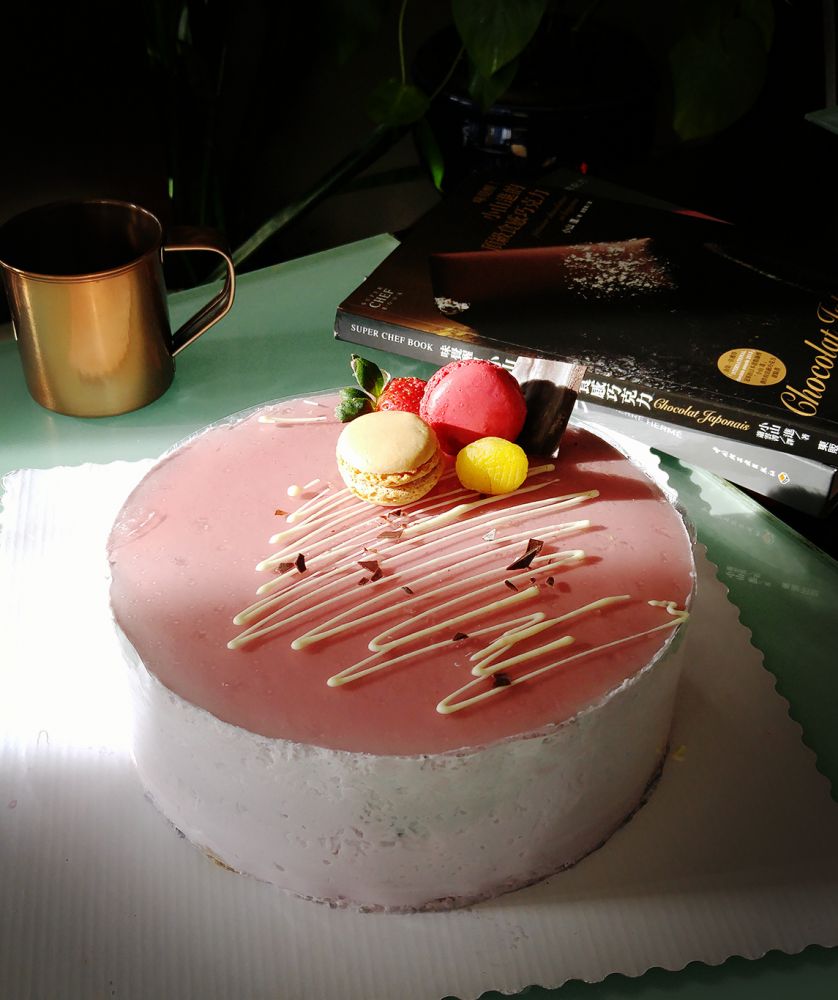蛋糕做好后,在蛋糕表面淋上一层花果茶淋面,等凝固后加简单装饰。