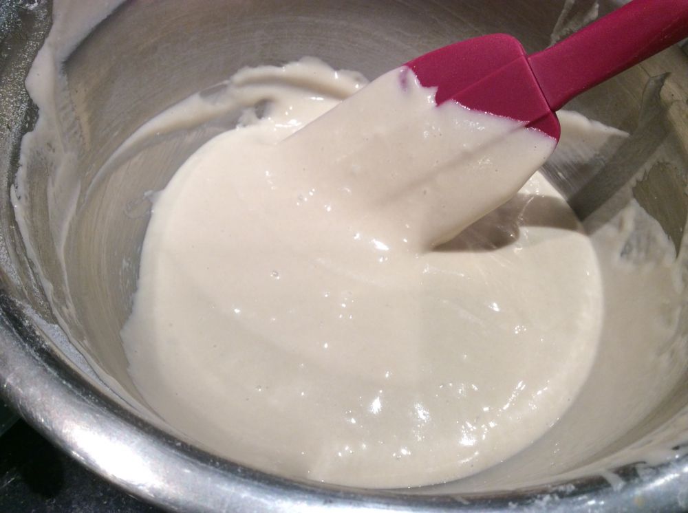 2,最后加低粉(过筛)略加拌匀至光滑细腻无颗粒。静置半小时(静置的同时打开烤箱,装备烤盘,打好蛋白)。调好的面糊较稀,用刮刀挑起可以顺畅垂落成蝴蝶结状。