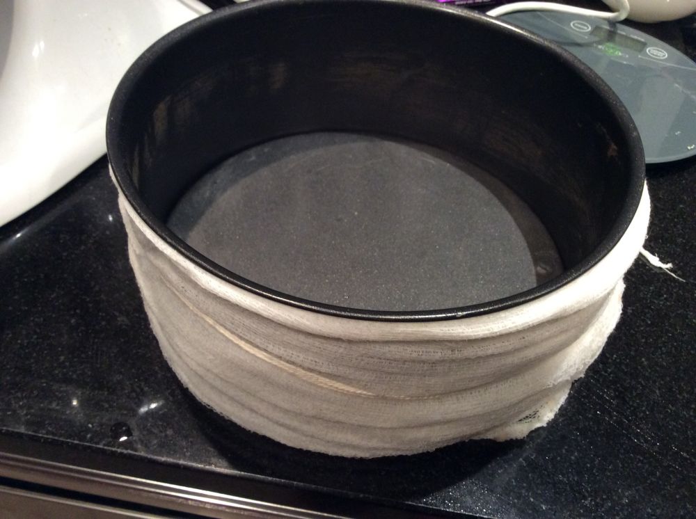 3,准备模具,把一条厚一些的厨房布用水完全浸湿,拧干,包住模具的四周。打开烤箱设定温度140°C。